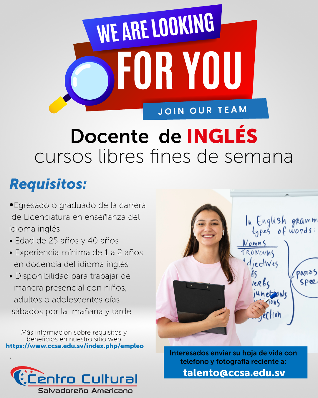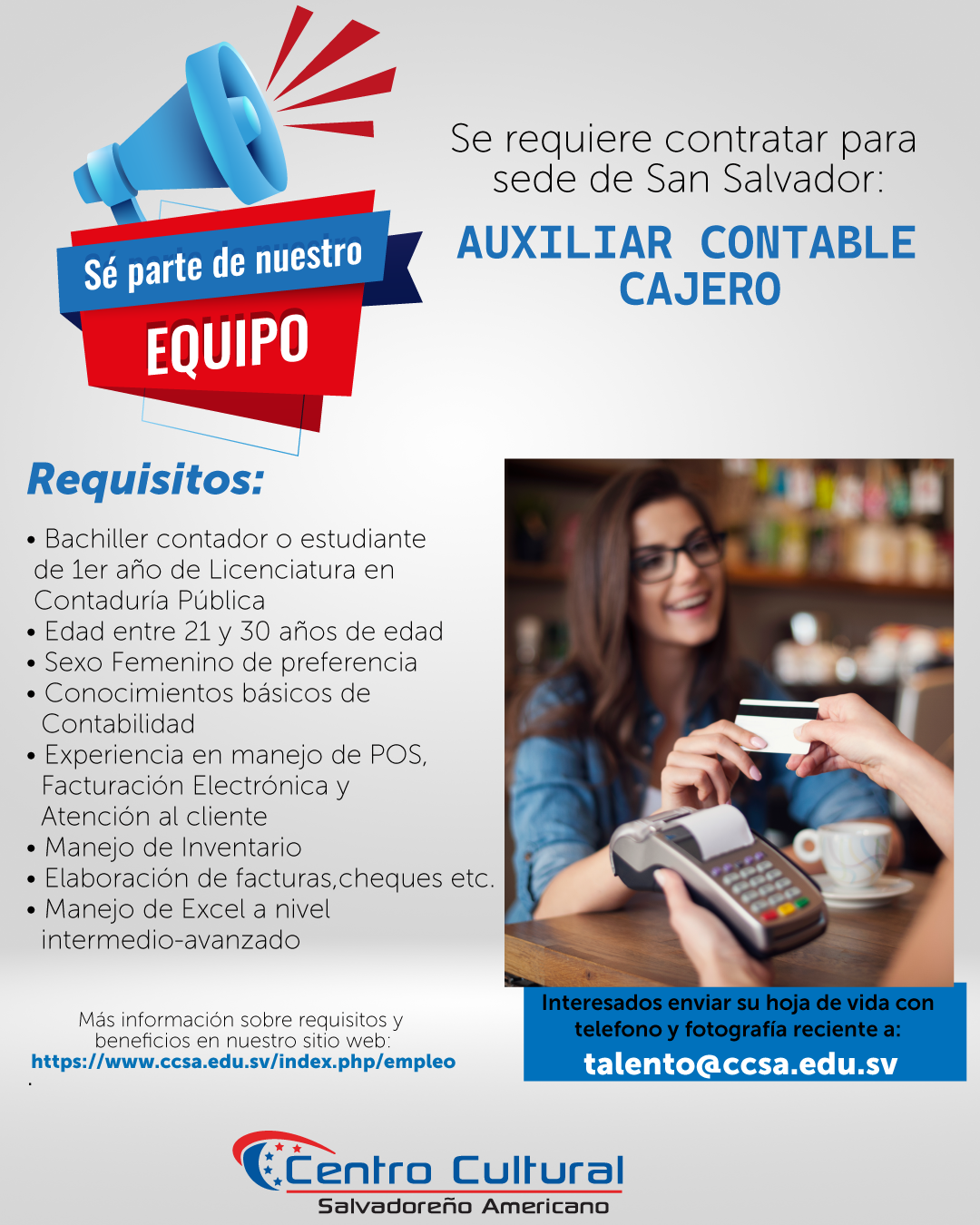 Interesados mandar su hoja de Vida con fotografía reciente y atestado (indispensable) a: talento@ccsa.educ.sv