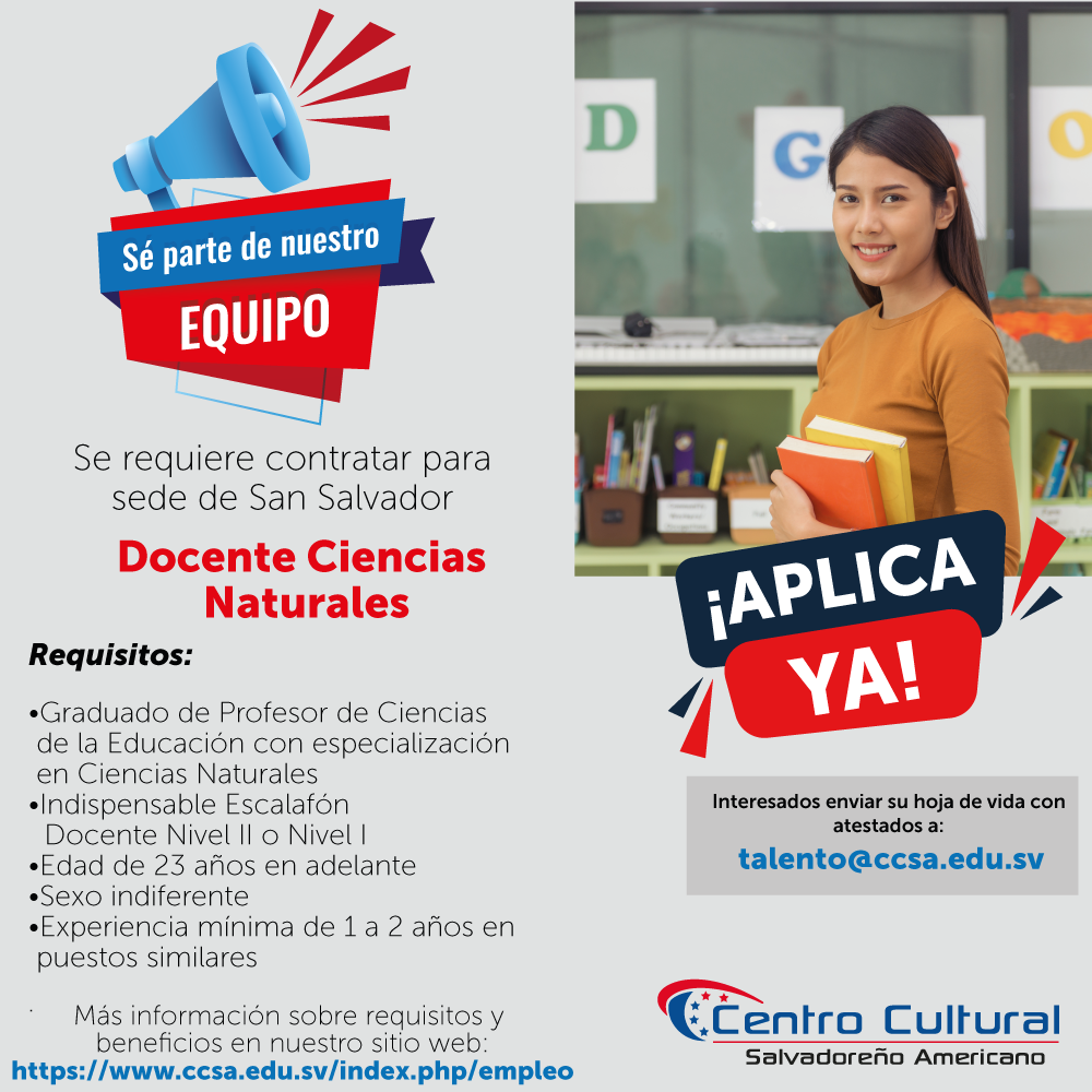 Interesados mandar su hoja de Vida con fotografía reciente y atestado (indispensable) a: talento@ccsa.educ.sv