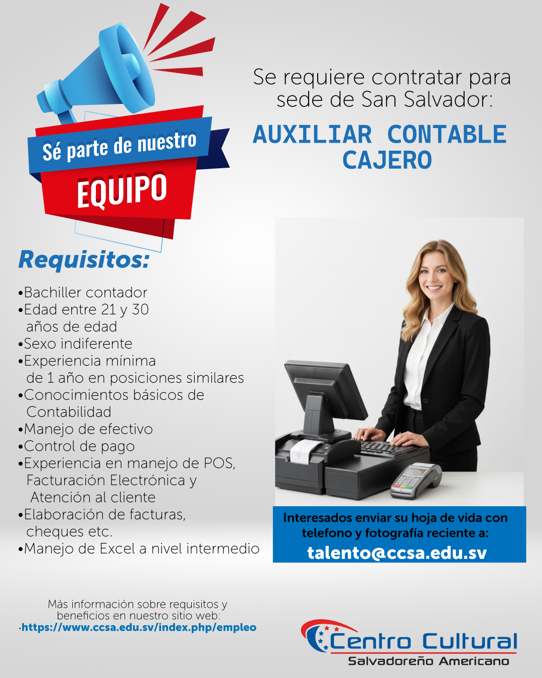 Interesados mandar su hoja de Vida con fotografía reciente y atestado (indispensable) a: talento@ccsa.edu.sv